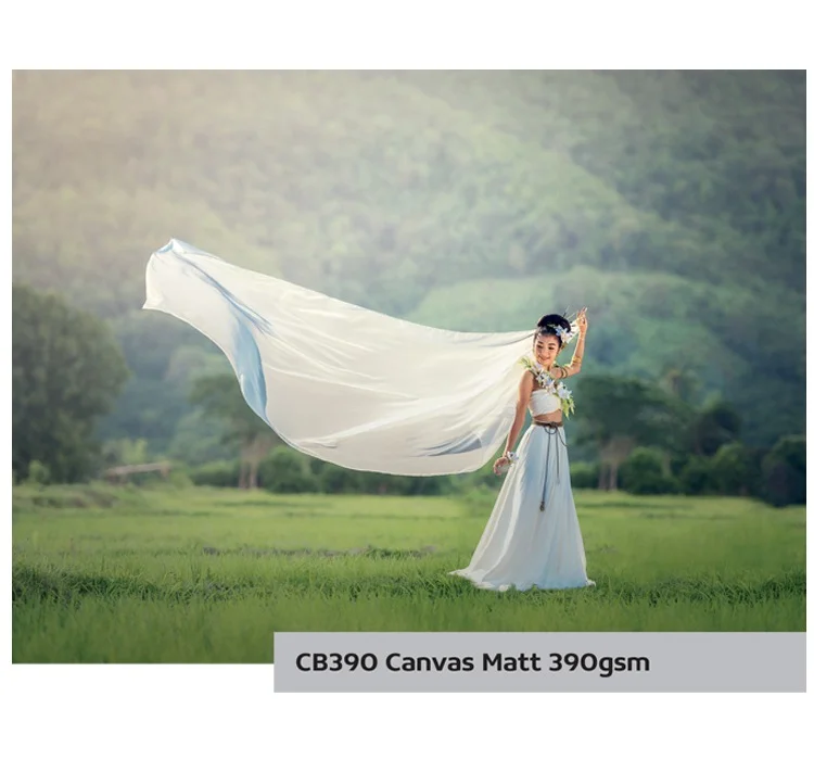 Płótno IMPRIME CB390 Canvas Matt jest jednostronnie powlekaną tkaniną poli / bawełnianą do wymagających zastosowań graficznych na wszystkich zwykłych termicznych i piezoelektrycznych drukarkach atramentowych na bazie wody i pigmentowego atramentu. Ze względu na obecność składników naturalnych (bawełna) w materiale bazowym, właściwości powierzchniowe mogą się nieznacznie różnić. Ze względu na elastyczną powłokę w splocie poli / bawełnianym po zadruku podczas rozciągania na krosna, na załamaniach mogą ukazać się delikatne pęknięcia.