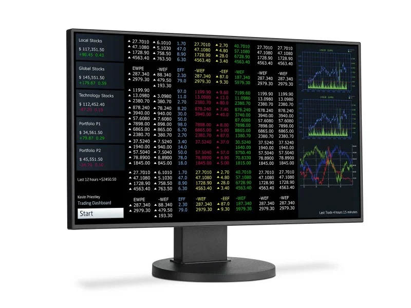 Monitor z ultracienką maskownicą wymaga mniej miejsca bez rezygnacji z dużych rozmiarów ekranu, a jego zgrabny i elegancki wygląd wnosi na parkiety giełdowe świeży powiew profesjonalizmu.