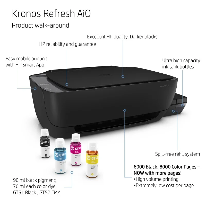 Print up to 8,000 pages with a set of HP colour bottles or up to 6,000 pages with an HP black ink bottle.3
