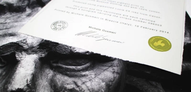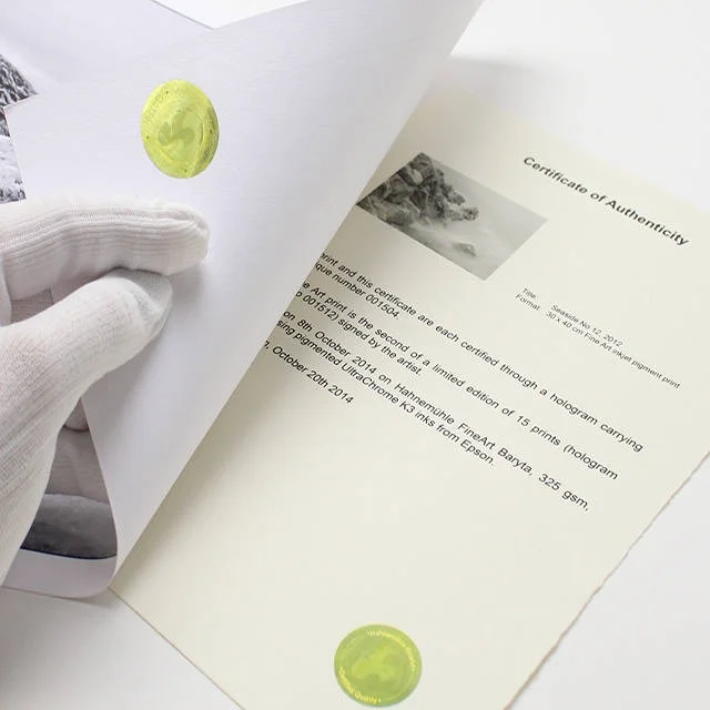 Każdy certyfikat jest wykonany z najwyższej jakości papieru i posiada fluorescencyjne włókna zabezpieczające - w formacie A4 oraz z nadrukiem Hahnemühle. Na certyfikat należy nakleić hologram opatrzony indywidualnym numerem. Drugi, identyczny hologram powinien być następnie umieszczony do odwrotnej strony grafiki.