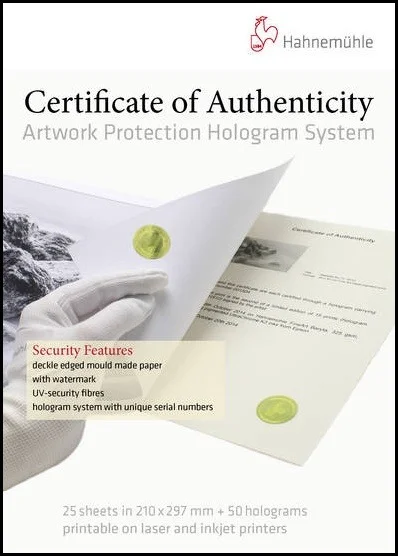 Certyfikat Autentyczności Hahnemühle został zaprojektowany w celu ochrony bezpieczeństwa i autentyczności Twoich prac i reprodukcji na papierze Hahnemühle oraz w celu zmniejszenia ryzyka fałszowania.