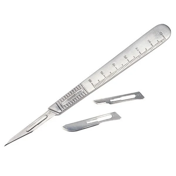 Metalowy skalpel z podziałką mm w uchwycie, z ostrzami wymiennymi.