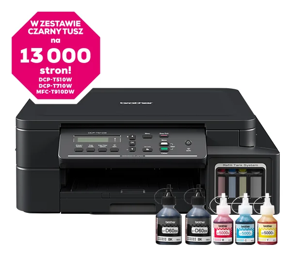 System szybkiego i prostego napełniania pojemników tuszem, pozwala na drukowanie dużych ilości dokumentów przy niskim koszcie wydruku pojedynczej strony. Razem z modelem DCP-T510W otrzymasz 2 butelki z czarnym tuszem (każda o wydajności do 6500 stron) i po 1 butelce z koloru cyjan, magenta i żółty (każda o wydajności do 5000 stron).