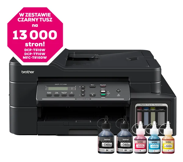 System szybkiego i prostego napełniania pojemników tuszem, pozwala na drukowanie dużych ilości dokumentów przy niskim koszcie wydruku pojedynczej strony. Razem z modelem DCP-T710W otrzymasz 2 butelki z czarnym tuszem (każda o wydajności do 6500 stron) i po 1 butelce z koloru cyjan, magenta i żółty (każda o wydajności do 5000 stron).