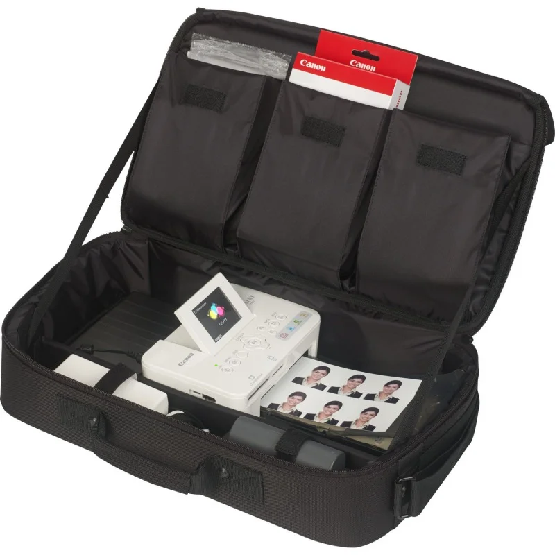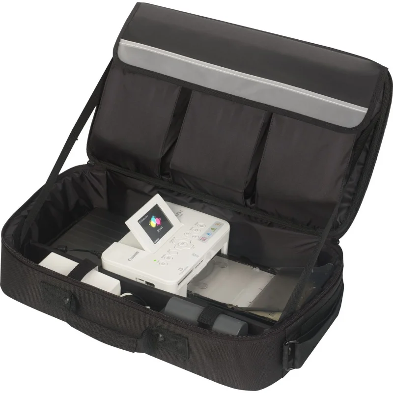 Torba na drukarkę CANON Selphy DCCCP3 umożliwia drukowanie bez potrzeby wyjmowania drukarki z torby. Ma przegrody i kieszenie, w których można umieścić wszystkie potrzebne akcesoria, w tym akumulator, zasilacz i materiały eksploatacyjne. Drukarka i pozostałe elementy nie wchodzą w skład zestawu.