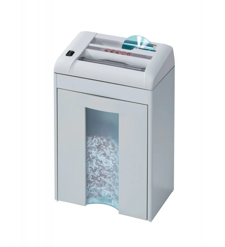 Nowoczesna, przybiurkowa niszczarka biznesowa z osobną szczeliną podawczą i zespołem tnącym przeznaczonym do niszczenia płyt CD/DVD. Wyposażona w wysuwany pojemnik z przezroczystym oknem umożliwiającym stałą kontrolę ścinków i dwoma osobnymi komorami na resztki papieru i płyty CD/DVD. Odporna na zszywki i spinacze biurowe.