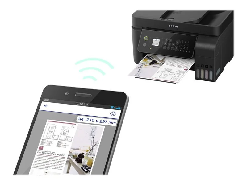 Dzięki obsłudze Wi-Fi i Wi-Fi Direct można przesyłać dokumenty do wydrukowania z urządzeń inteligentnych, używając aplikacji Epson iPrint. Drukarka posiada również port Ethernet.