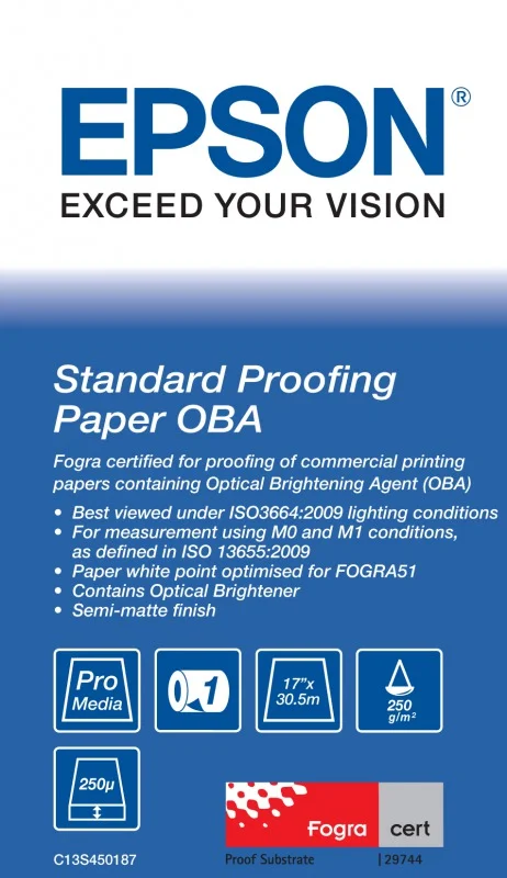 Ten papier do proofingu, który jest uzupełnieniem oferty firmy Epson, umożliwia drukarniom, agencjom projektowym i firmom specjalizującym się w proofingu tworzenie proofów z dokładnie odwzorowanymi kolorami. Najnowsza wersja papieru Standard Proofing Paper zawiera wybielacz optyczny OBA (Optical Brightening Agent), który pozwala uzyskać biel zbliżoną do bieli papieru używanego podczas produkcji.