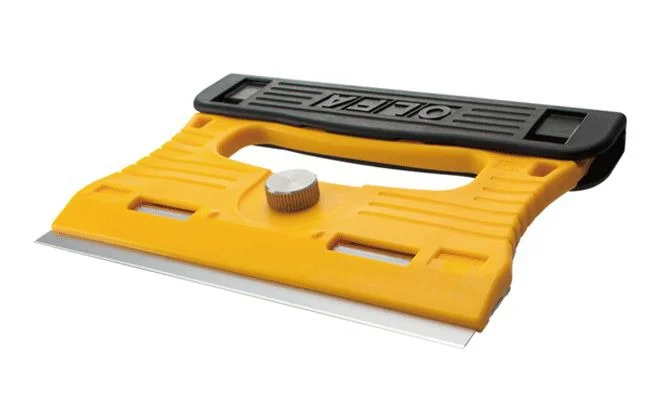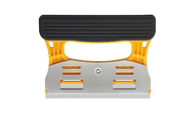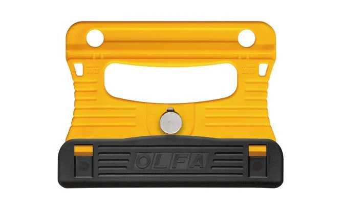 Uchwyt oraz osłona ostrza wykonane z żywicy polipropylenowej wzmocnionej włóknem szklanym zapewniają zwiększoną wytrzymałość i odporność na aceton. Razem z płytką ze stali nierdzewnej mocującą ostrze tworzą uchwyt o grubości 7mm /ze śrubą mocującą - 14mm/. Rowkowanie na żółtej powierzchni uchwytu i czarnej osłonie ostrza pomagają znaleźć pewny i wygodny sposób trzymania narzędzia. Skrobak jest bardzo lekki, waży tylko 115 gramów.