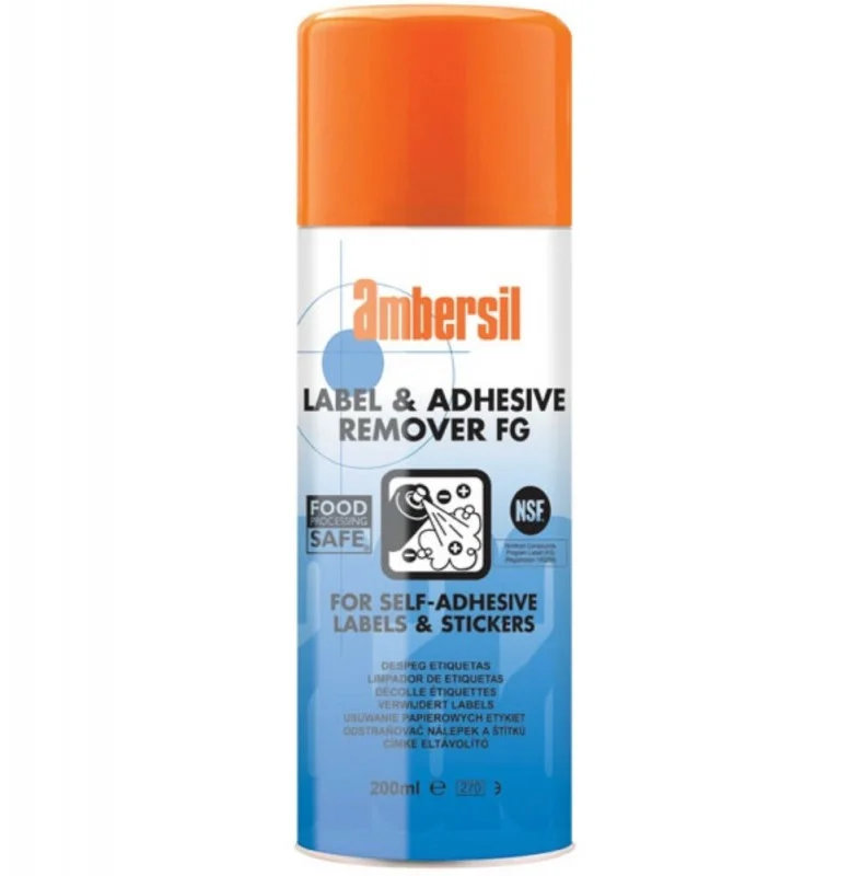 Ambersil Label & Adhesive Remover FG - oparty na bazie olejków cytrusowych i rozpuszczalników preparat do usuwania naklejek i etykiet samoprzylepnych. Możliwość użycia w zakładach przetwórstwa żywności. Neutralizuje działanie kleju umożliwiając całkowite i szybkie usunięcie naklejki. Idealny do stosowania na różnych twardych powierzchniach.