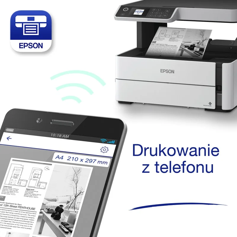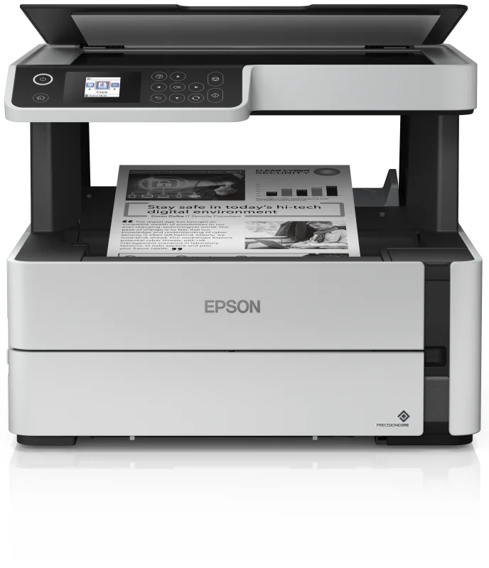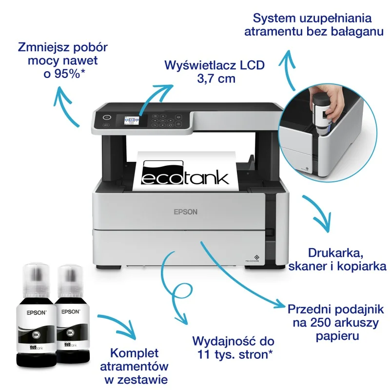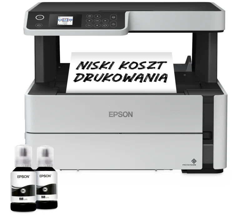 Epson EcoTank M2170 to nowoczesne urządzenie wielofunkcyjne, które łączy funkcje drukowania, skanowania i kopiowania, oferując wyjątkową oszczędność, wysoką jakość wydruków oraz wygodę użytkowania. Dzięki technologii stałego zasilania w atrament użytkownicy mogą cieszyć się niezwykle niskimi kosztami eksploatacji oraz minimalną koniecznością konserwacji, co przekłada się na większą efektywność pracy. Dzięki dołączonemu czarnemu atramentowi urządzenie pozwala na wydrukowanie do 11 000 stron, co sprawia, że jest to doskonałe rozwiązanie dla firm i biur o wysokim zapotrzebowaniu na monochromatyczne wydruki. Brak konieczności rozgrzewania oraz szybkość drukowania do 20 stron na minutę zapewniają natychmiastową gotowość do pracy i wysoką efektywność. Epson EcoTank M2170 został wyposażony w 3,7 cm kolorowy ekran LCD, który umożliwia intuicyjną obsługę oraz komfortowe zarządzanie ustawieniami drukarki.