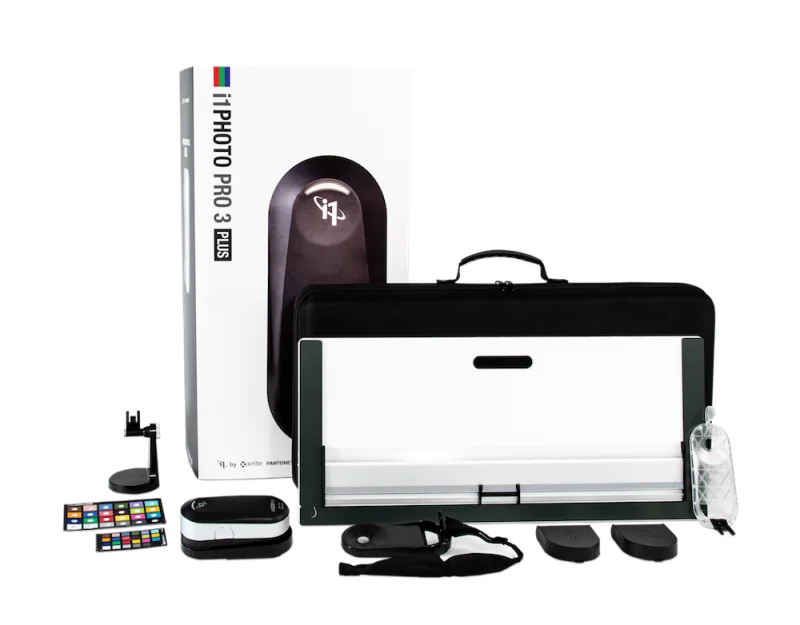 Spektrofotometr i1Pro 3 (urządzenie pomiarowe), podkładka kalibracyjna, głowica do pomiaru oświetlenia zewnętrznego, filtr polaryzacyjny, uchwyt do kalibracji monitora, podkładka do pomiarów punktowych, prowadnica XL, podkładka pomiarowa XL, kabel USB.