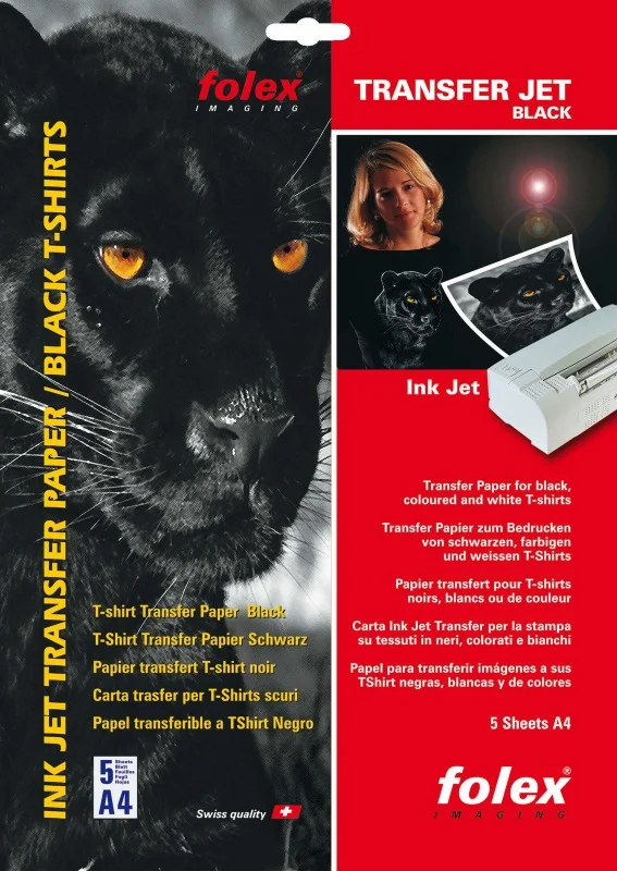 FOLEX TRANSFER JET BLACK to papier transferowy do czarnych i ciemnych tkanin, tzw. papier do naprasowanek. Wydruki przenosi się na tkaniny z pomocą żelazek lub pras ciśnieniowo-termicznych. Prosty sposób na przygotowanie okolicznych tshirtów.