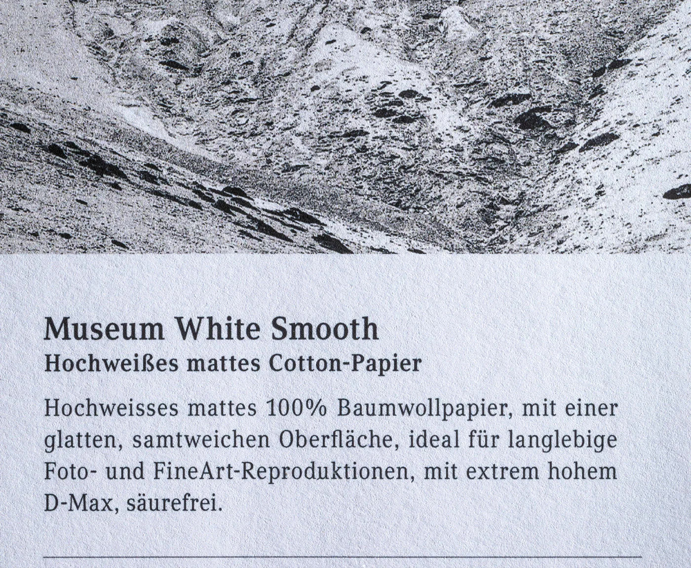 Museum White Smooth to najwyższej jakości papier artystyczny, wykonany w 100% z bawełny, zaprojektowany specjalnie dla wymagających fotografów i twórców sztuki. Jego aksamitnie gładka, biała powierzchnia z subtelną fakturą nadaje wydrukom wyjątkową elegancję i profesjonalny charakter. Dzięki niskiej zawartości optycznych rozjaśniaczy oraz bezkwasowej strukturze papier zapewnia długowieczność, co czyni go doskonałym wyborem do archiwizacji, wystaw i galerii. Museum White Smooth gwarantuje perfekcyjne odwzorowanie barw, wysoką intensywność kolorów oraz niezwykle wysoki współczynnik D-Max. Dzięki wykorzystaniu nowoczesnej technologii powlekania papier Museum White Smooth zachowuje idealną stabilność i równomierność, a jego powierzchnia wolna od pyłków gwarantuje czyste i bezproblemowe drukowanie. Szczególnie ceniony jest w fotografii czarno-białej, gdzie naturalna biel podłoża podkreśla neutralność i autentyczność odcieni.