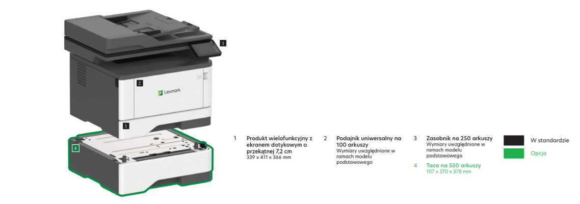 stron — dzięki niemu można zwiększyć liczbę wydruków i ograniczyć czas przestojów. Opcjonalny zasobnik papieru zwiększa łączną pojemność wejściową do 900 arkuszy, co umożliwia dłuższe drukowanie i zapewnia większą elastyczność w zakresie