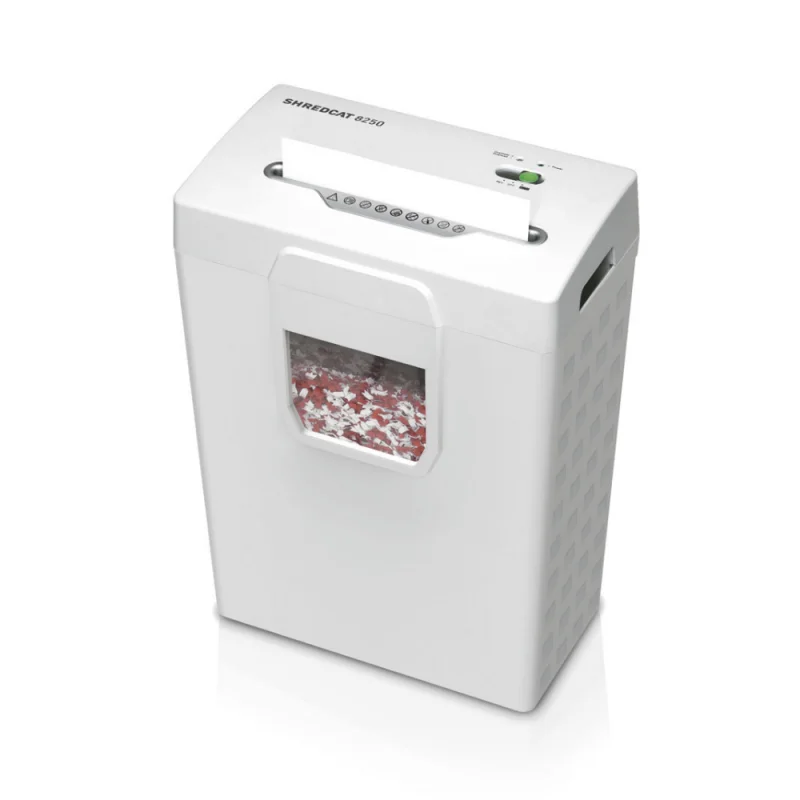 Niszczarka Shredcat 8250 CC tnie w systemie paskowo-odcinkowym (4 stopień tajności według światowej normy ISO/IEC 21964). Cechuje ją cichy i mocny silnik (140 Watów) oraz zerowe zużycie energii w trybie AutoEco. Dodatkowym atutem jest elegancki kosz na ścinki z oknem pokazującym poziom napełnienia. Przy próbie ściągnieęcia głowicy system automatycznie zatrzymuje pracę niszczarki.