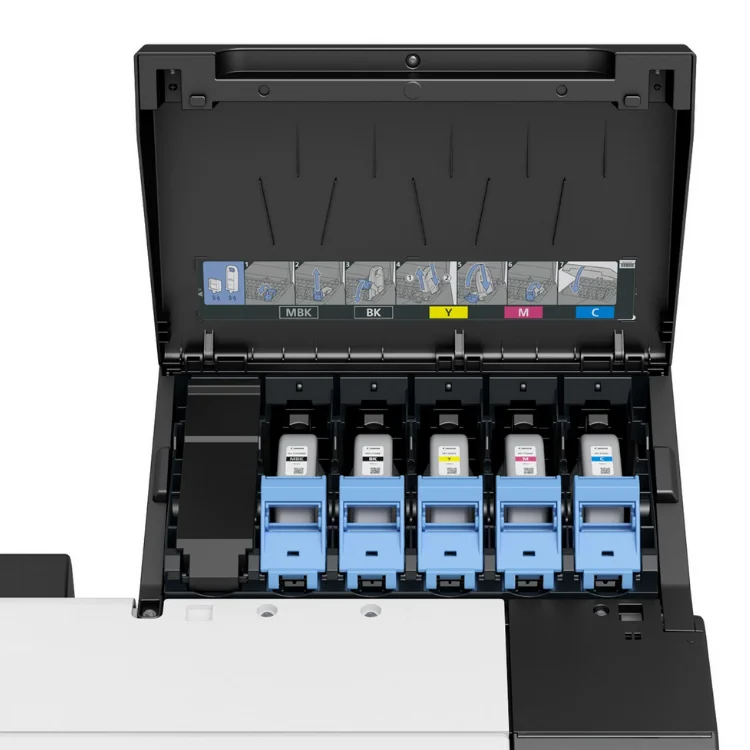 - Zawartość pudełka: Drukarka, 1 głowica drukująca, 3-calowy uchwyt tuby papieru, przewód zasilający, 1 zestaw startowych zbiorników z atramentem (330ml (matowy czarny), 130 ml (czarny, błękitny, purpurowy, żółty)), instrukcja konfiguracji, płyta CD-ROM (sterowniki), arkusze informacyjne