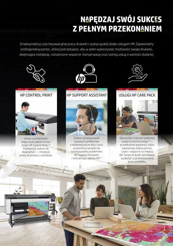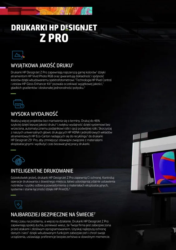 Wydajność - realizuj więcej zleceń dzięki większej prędkości. Przyjmuj więcej zleceń dzięki możliwości drukowania o 18% szybciej przy lepszej jakości na satynowym nośniku zdjęciowym o 46% szybciej na płótnie. Zwiększ swoją wydajność dzięki najszybszej obsłudze nośników, eliminacji wrzeciona z układu i automatycznemu podawaniu rolki. Ogranicz interwencje związane z materiałami eksploatacyjnymi dzięki podlegającym recyklingowi wkładom atramentowym HP Eco-Carton o pojemności 1 litra.