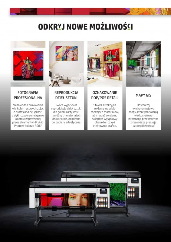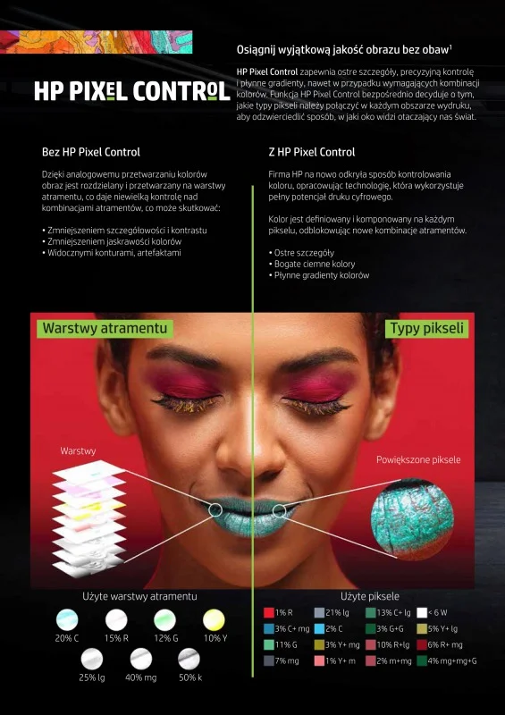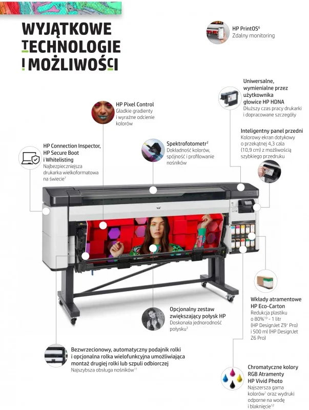 Niezwykle rozwiązanie - wyjątkowo żywa kolorystyka dzięki najszerszej gamie kolorów. Urządzenie gwarantuje najszerszą gamę kolorów w swojej kategorii dzięki chromatycznym atramentom zdjęciowym RGB HP Vivid. Generuj niestandardowe profile ICC i osiągaj dokładność kolorów oraz spójność kolorystyki dzięki wbudowanemu spektrometrowi. Uzyskaj wygładzone gradienty i możliwość reprodukcji niestandardowych odcieni kolorystycznych dzięki funkcji HP Pixel Control.