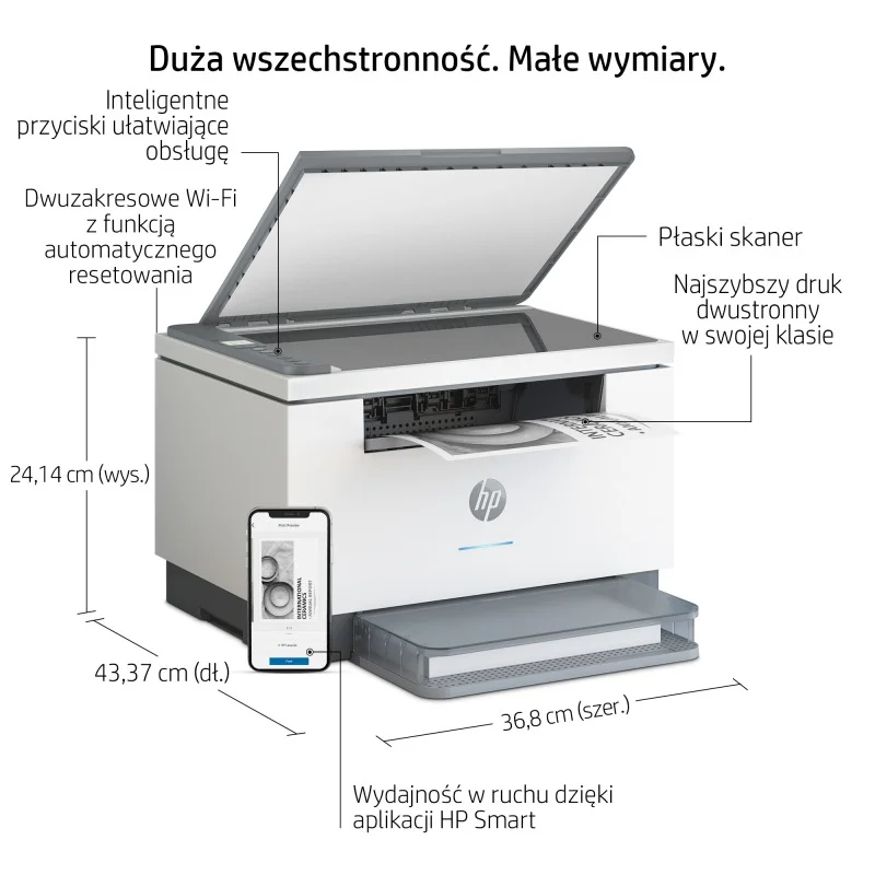 Kompaktowa konstrukcja tego urządzenia LaserJet pozwala na ustawienie go niemal w dowolnym miejscu. Szybko wykonuj projekty dzięki drukarce, która zmieści się niemal wszędzie.