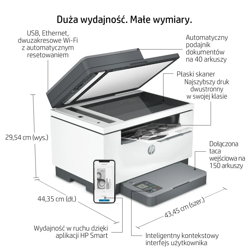 Zachowaj swoją produktywność z dowolnego miejsca dzięki dwupasmowej sieci Wi-Fi™ z funkcją samoczynnego resetowania, która zapewnia większy zasięg i szybsze, bardziej niezawodne połączenia. To pozwoli Ci pracować bez przeszkód i korzystać z drukarki bez względu na miejsce, w którym się znajdujesz. Aplikacja HP Smart dodatkowo ułatwia Twoje codzienne zadania. Dzięki niej możesz łatwo skanować w wysokiej jakości i udostępniać dokumenty za pomocą Dropbox, Google Drive, poczty elektronicznej lub chmury, praktycznie z każdego miejsca. Dodatkowo, szybki dostęp oraz drukowanie dokumentów i obrazów ze smartfona, Dropbox i Google Drive, sprawiają, że Twoja praca staje się jeszcze bardziej efektywna. Drukarka HP LaserJet to rozwiązanie, które łączy wydajność, prostotę obsługi i zaawansowane funkcje, pozwalając Ci pracować szybko i efektywnie, niezależnie od miejsca i czasu.