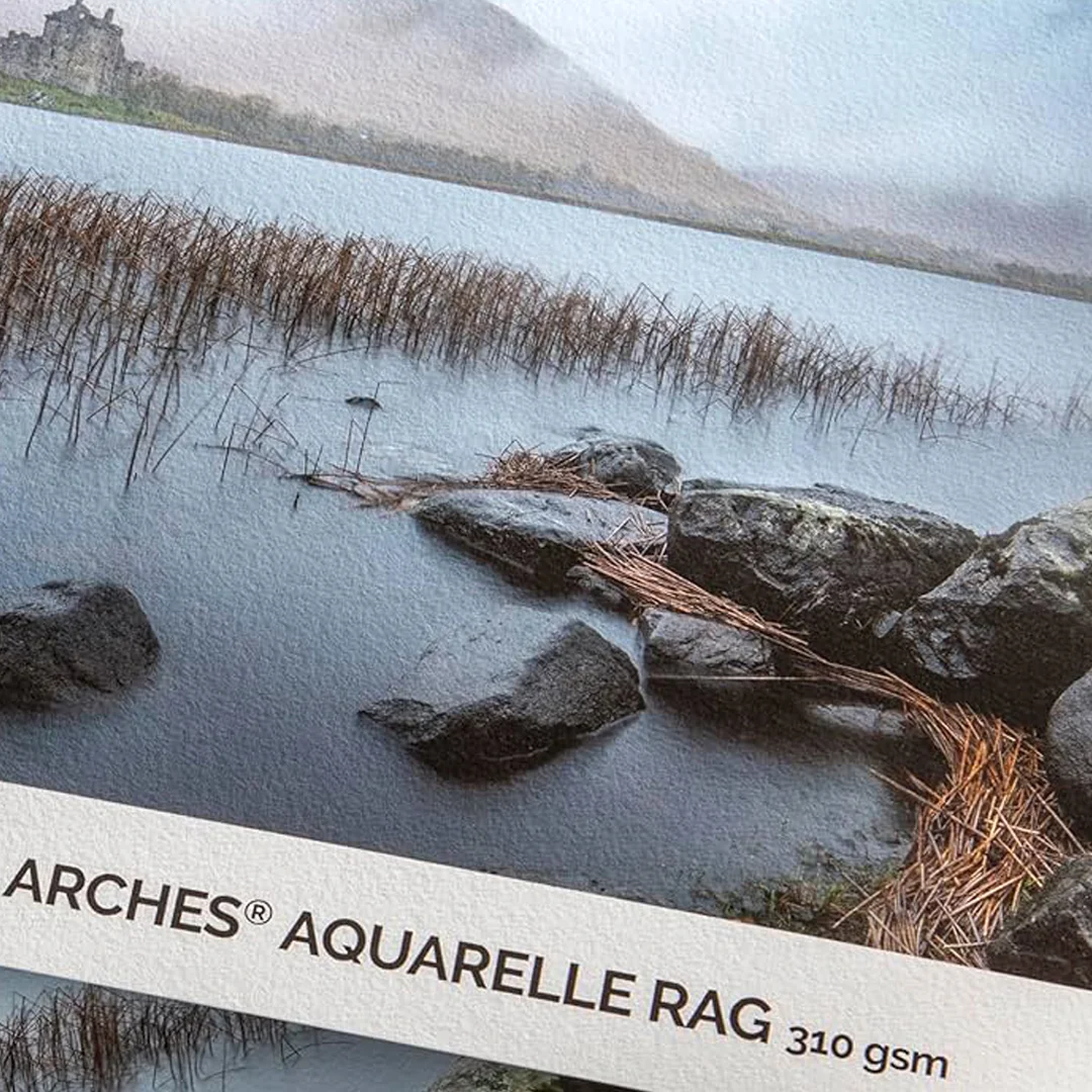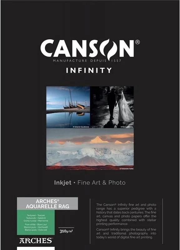 Arches Aquarelle Rag to papier fotograficzny akwarelowy o wielowiekowej tradycji, uznawany przez artystów na całym świecie za jeden z najbardziej prestiżowych nośników do prac artystycznych. Mistrzowie papieru Arches doskonalą swoje rzemiosło od 1492 roku, a dziś marka ta pozostaje jedyną papiernią we Francji, która stosuje tradycyjny proces formowania cylindrycznego we wszystkich swoich papierach.  Wykonany w 100% z najwyższej jakości bawełny, papier ten wyróżnia się naturalnym ziarnem i subtelnym wykończeniem filcowym, inspirowanym klasyczną bazą akwarelową. Dzięki temu oferuje niezwykle przyjemną fakturę i wyjątkową trwałość, zachowując jednocześnie autentyczny charakter tradycyjnych papierów artystycznych. Czysta, naturalna biel bez dodatku wybielaczy optycznych (OBA) podkreśla głębię i subtelność kolorów. Aquarelle Rag pozwala fotografom, artystom i drukarzom tworzyć cyfrowe odbitki artystyczne o wyjątkowej estetyce.