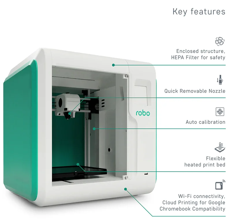 W Robo E3 została zastosowana automatyczna regulacja stołu roboczego. Dzięki temu więcej czasu możesz poświęcić na drukowanie i projektowanie.