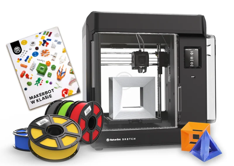 Zamów innowacyjny zestaw do swojej szkoły. W komplecie otrzymasz: drukarkę 3D MakerBot SKETCH, 5 kg filamentu MakerBot PLA, 2 stoliki robocze, zestaw narzędzi do postprocessingu, dostęp do platform edukacyjnych i projektowych, pomoce dydaktyczne oraz szkolenie dla nauczycieli.
