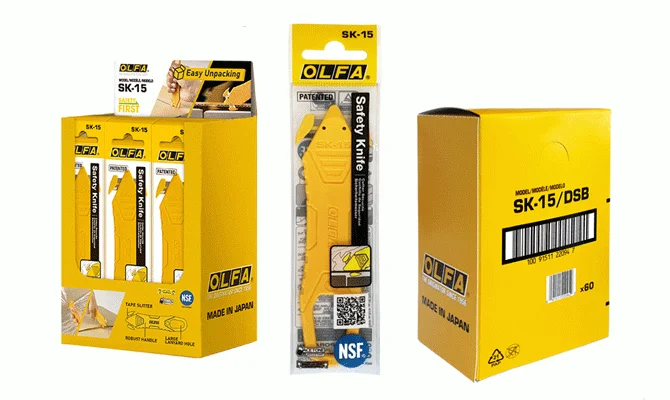 Opakowanie jednostkowe SK-15/10 zawiera 10 sztuk noża SK-15. W naszym magazynie dostępne są również kartonowe dyspenzery o symbolu SK-15/DSB zawierające po 60 sztuk noży pakowanych indywidualnie w woreczki foliowe, które w prosty sposób można przekształcić w ekspozytory naladowe do sprzedaży detalicznej.