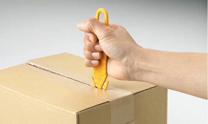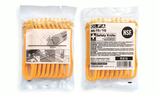 Nóż bezpieczny, z ukrytym stałym, nierdzewnym ostrzem. Zaproponowane rozwiązanie eliminuje konieczność uciążliwego wysuwania ostrza do każdego cięcia, a jego zamontowanie w rękojeści jest bezpieczne zarówno dla użytkownika jak i zawartości rozcinanego opakowania. Odpowiednie wyprofilowanie szczeliny, w której osadzone jest ostrze zmniejsza tarcie i przekłada się na skuteczność i trwałość narzędzia. Klinowo ukształtowana górna część uchwytu spełnia rolę przecinaka do taśm pakunkowych, a duży otwór w dolnej jego części pozwala na powieszenie narzędzia na haku lub przypięcie smyczy ułatwiającej wygodne noszenie narzędzia przy sobie.W przypadku noża SK-15, wymienne ostrza nie będą powodem skaleczeń ani nie zgubią się w miejscu pracy ponieważ ostrze jest niewymienne. A nóż ten jest idealny do cięcia tektury falistej, otwierania kartonów, obcinania folii termokurczliwej, przecinania plastikowych taśm spinających, pakunkowych itp.