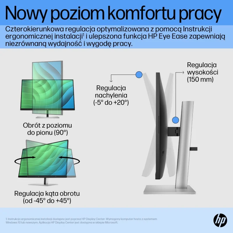 Gdy najlepsze wyniki zależą od świetnego samopoczucia, łatwo znaleźć całodzienny komfort, dzięki 4-kierunkowej regulacji zoptymalizowanej przez poradnik ergonomicznej konfiguracji w HP Display Center. Zadbaj o komfort swoich oczu, dzięki monitorowi z technologią eliminacji migotania, częstotliwością odświeżania 75 Hz i funkcją HP Eye Ease - zawsze włączonym, wbudowanym filtrem światła niebieskiego.