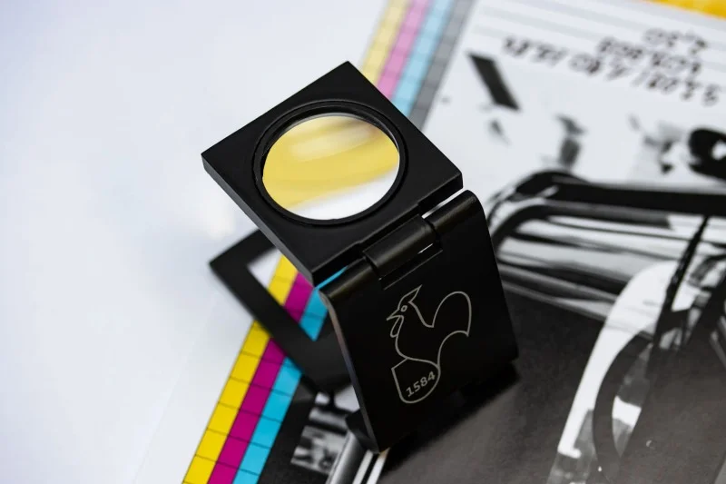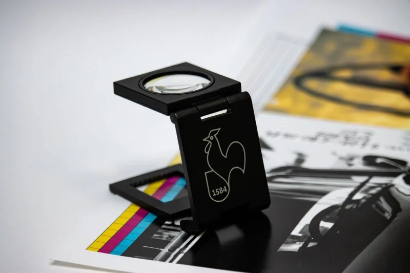 Lupa do podglądu wydruków w metalowej obudowie. Zawiera szkło powiększające, skalę do dokładniejszej kontroli wydruków i dzieł sztuki, skórzane etui.
