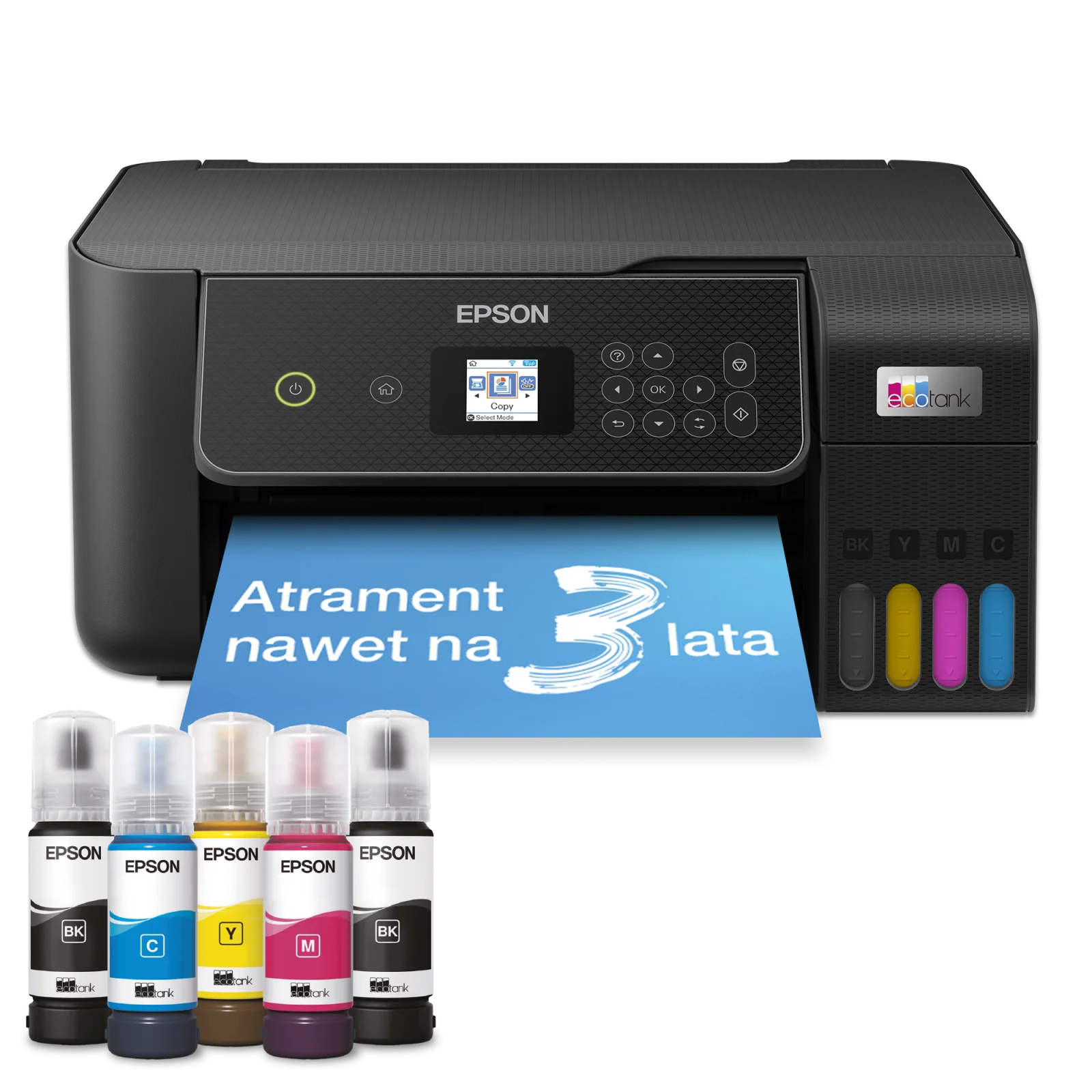 Drukarka wielofunkcyjna A4 Epson EcoTank L3280 to idealne rozwiązanie dla użytkowników domowych i małych biur, zapewniające wygodne i ekonomiczne drukowanie. Zastosowanie pojemnych zbiorników na atrament o dużej pojemności eliminuje konieczność częstego uzupełniania, a specjalne blokady na butelkach atramentu uniemożliwiają pomyłkowe napełnianie pojemników. Dzięki tej ekonomicznej drukarce można zaoszczędzić nawet do 90% na kosztach drukowania. W zestawie znajduje się atrament wystarczający nawet na 3 lata, pozwalający wydrukować do 8100 stron w czerni i 6500 stron w kolorze. Drukarka Epson EcoTank L3280 wyposażona jest w kolorowy wyświetlacz LCD o przekątnej 3,7 cm, tylny podajnik papieru na 100 arkuszy oraz umożliwia drukowanie zdjęć bez marginesów do formatu 10x15 cm. Szybkość drukowania do 10 stron na minutę pozwala efektywnie wykonywać różne zadania. Dzięki kompaktowej konstrukcji oraz pełnej łączności Wi-Fi i Wi-Fi Direct, drukarkę łatwo połączyć z innymi urządzeniami w domu, umożliwiając drukowanie z urządzeń mobilnych, tabletów i laptopów.