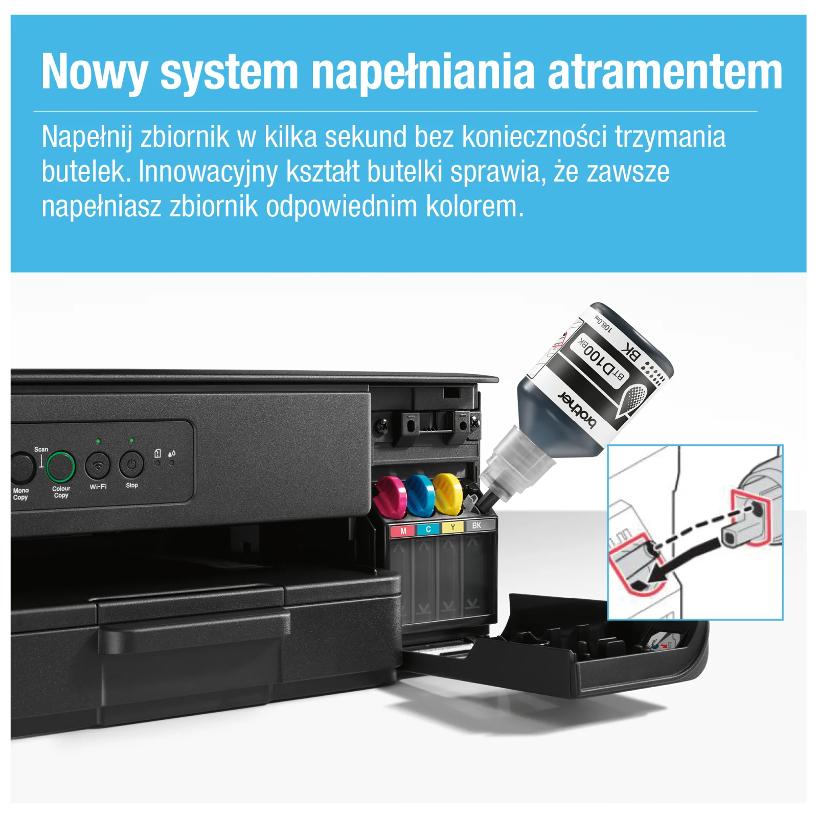 Brother DCP-T430W to kompaktowe, wielofunkcyjne urządzenie, stworzone z myślą o użytkownikach poszukujących niezawodnego rozwiązania do codziennego drukowania, skanowania i kopiowania. Dzięki niewielkim wymiarom z łatwością zmieści się na każdym biurku, oferując pełną funkcjonalność bez konieczności rezygnowania z przestrzeni czy wydajności. Drukarka wyposażona jest w przedni podajnik na 150 arkuszy, który chroni papier przed wilgocią i kurzem, co przekłada się na wysoką jakość wydruków i bezproblemowe użytkowanie. System zbiorników z przodu urządzenia umożliwia szybkie i precyzyjne uzupełnianie atramentu, a przezroczyste zbiorniki pozwalają łatwo kontrolować poziom tuszu. Zwiększ produktywność, elastyczność i wygodę dzięki łączności bezprzewodowej. Niezależnie od tego, czy korzystasz z urządzenia do celów prywatnych, czy biznesowych, drukuj bez wysiłku z dowolnego urządzenia, bez konieczności używania kabli.
