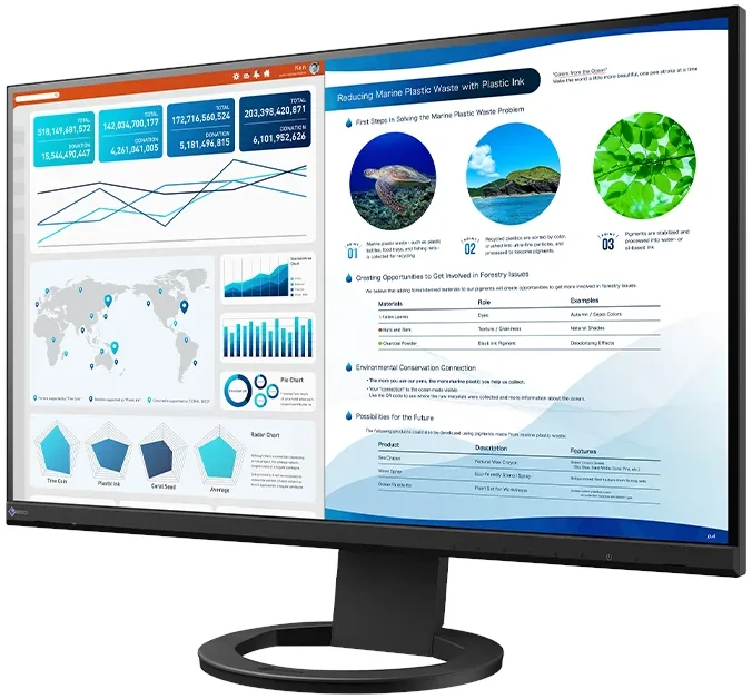 Estetyka monitora odgrywa kluczową rolę w tworzeniu przyjaznej, funkcjonalnej i inspirującej przestrzeni do pracy. Niezależnie od tego, czy pracujesz zdalnie w domowym biurze, czy też w nowoczesnym środowisku korporacyjnym, dopracowany wizualnie wygląd monitora może znacząco wpłynąć na komfort użytkowania. Model ten wyróżnia się niemal bezramkową konstrukcją, która nadaje mu lekkości i nowoczesności, a jednocześnie ułatwia korzystanie z konfiguracji wielomonitorowych, pozwalając na bardziej płynne przejście obrazu pomiędzy ekranami. Monitor dostępny jest w dwóch stylowych wersjach kolorystycznych - eleganckiej czerni oraz subtelnej bieli. W zestawie znajdują się odpowiednio dopasowane kolorystycznie przewody, które pozwalają zachować estetyczny porządek na biurku i podkreślają spójną stylistykę urządzenia. Taki przemyślany design sprawia, że monitor doskonale komponuje się zarówno z klasycznymi, jak i nowoczesnymi aranżacjami wnętrz.