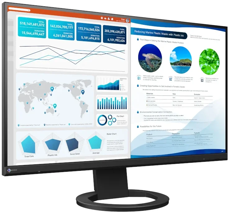W trosce o komfort użytkownika firma Eizo opracowała zaawansowaną technologię hybrydowego sterowania podświetleniem, która łączy zalety modulacji szerokości impulsu (PWM) oraz zasilania prądem stałym (DC). W odróżnieniu od konwencjonalnych rozwiązań, technologia ta wykorzystuje znacznie wyższe częstotliwości PWM, co przekłada się na całkowicie bezmigotaniowe wyświetlanie obrazu - przy zachowaniu doskonałej jakości oraz stabilności kolorów. Właściwości eliminujące migotanie oraz ograniczona emisja niebieskiego światła zostały potwierdzone certyfikatem TÜV Rheinland, co stanowi gwarancję najwyższych standardów ergonomii i bezpieczeństwa. Eizo EV2740S wyposażony został w wysokiej klasy matową powłokę antyodblaskową, która skutecznie niweluje refleksy świetlne. Dzięki rozproszeniu odbitego światła ekran zapewnia doskonałą czytelność obrazu nawet w silnie oświetlonych pomieszczeniach.