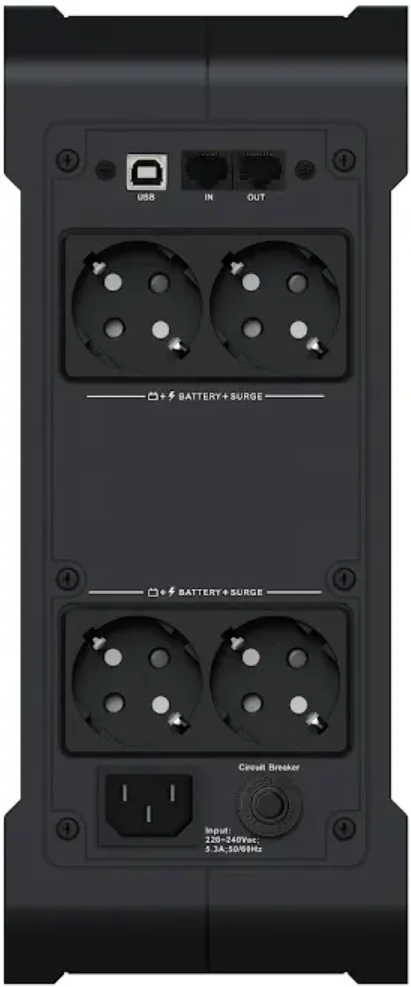- Gniazda rezerwowe akumulatora i zabezpieczone przed przepięciami: 4 (Schuko)