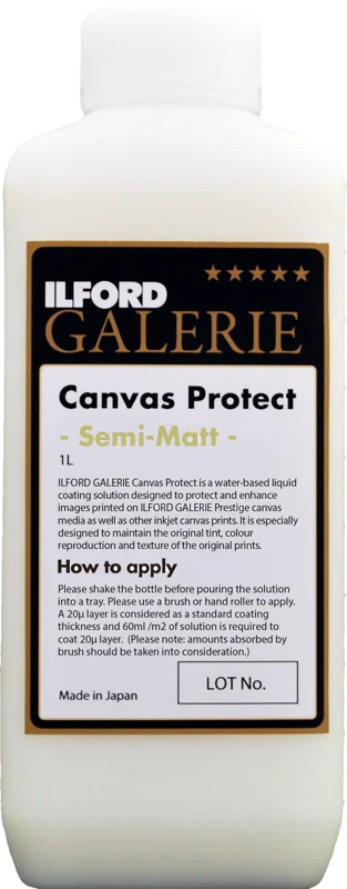 Ilford Galerie Canvas Protect to wodny laminat w płynie, opracowany specjalnie w celu ochrony oraz podkreślenia jakości wydruków wykonanych na płótnach z serii GALERIE, jak również innych płótnach atramentowych dostępnych na rynku. Zastosowanie preparatu Canvas Protect na wydrukach na płótnie minimalizuje lub całkowicie eliminuje ryzyko pękania podczas naciągania i zawijania materiału na krosna malarskie (stretcher bars). ILFORD Galerie Canvas Protect nie wpływa na oryginalny odcień, kolorystykę ani strukturę wydruku. Preparat jest wyjątkowo łatwy w aplikacji - można go nakładać zarówno za pomocą wałka, jak i standardowego pędzla.