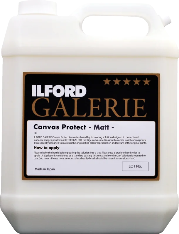 Ilford Galerie Canvas Protect to wodny laminat w płynie, opracowany specjalnie w celu ochrony oraz podkreślenia jakości wydruków wykonanych na płótnach z serii GALERIE, jak również innych płótnach atramentowych dostępnych na rynku. Zastosowanie preparatu Canvas Protect na wydrukach na płótnie minimalizuje lub całkowicie eliminuje ryzyko pękania podczas naciągania i zawijania materiału na krosna malarskie (stretcher bars). ILFORD Galerie Canvas Protect nie wpływa na oryginalny odcień, kolorystykę ani strukturę wydruku. Preparat jest wyjątkowo łatwy w aplikacji - można go nakładać zarówno za pomocą wałka, jak i standardowego pędzla.