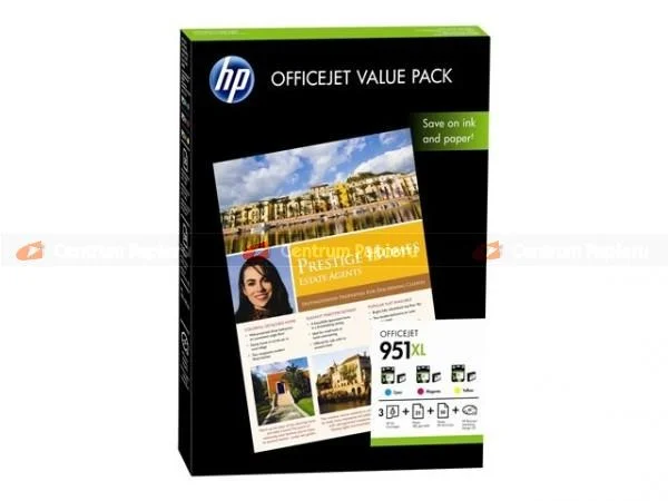 Zestaw tuszy HP 951XL (błękitny, purpurowy, żółty) + 75 arkuszy papieru fotograficznego HP
