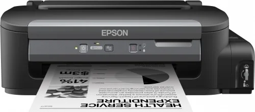 Epson WorkForce M100 to jednofunkcyjna monochromatyczna drukarka firmy Epson z wbudowanym systemem zasilania w jednokolorowy atrament i złączem Ethernet. System ciągłego zasilania w atrament idealnie nadaje się dla małych i domowych biur, które dążą do obniżenia kosztów związanych z drukowaniem. Dodatkowo w zestawie znajdują się dwie butelki z oryginalnym atramentem firmy Epson — jedna początkowa i jedna standardowa o pojemności 140 ml. Wydajność standardowej butelki z atramentem wynosi 6000 stron1.