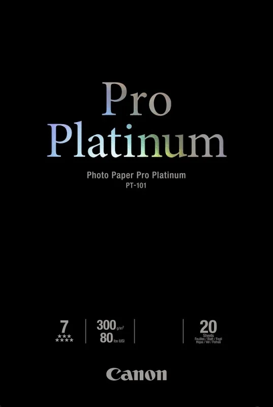 By najlepiej eksponować swoje prace, profesjonalni fotografowie potrzebują papieru, którego powierzchnię charakteryzuje najwyższy poziom połysku. W ofercie firmy Canon jest papier, który nie będzie wyglądał niewłaściwie w żadnej galerii — papier fotograficzny Pro Platinum. Sześciowarstwowa konstrukcja zapewnia wysoką gęstość optyczną, dzięki której można uzyskać najwyższą jakość studyjną.