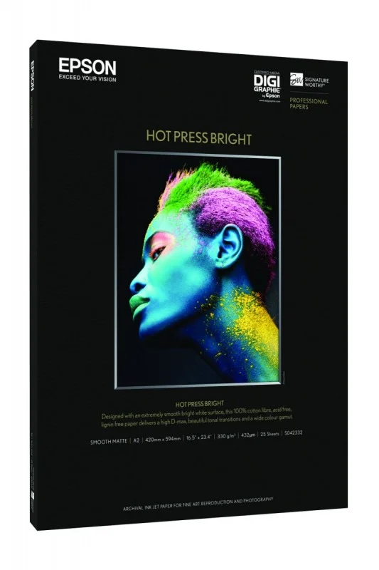 Do sztuki cyfrowej i fotografii artyści oraz profesjonalni fotografowie potrzebują prawdziwych nośników archiwizacyjnych o różnych gramaturach i właściwościach powierzchni. Firma Epson oferuje teraz bezkwasowy, 100-procentowy papier bawełniany Hot Press powleczony po obu stronach, co gwarantuje mu bardziej wszechstronne zastosowanie.