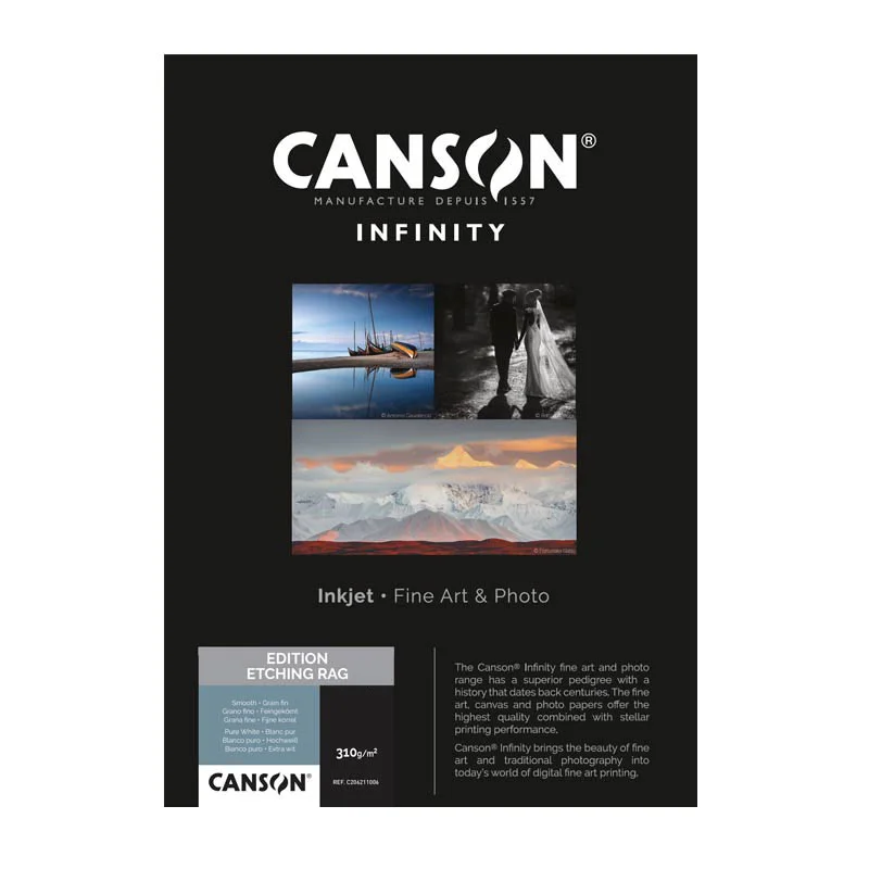 Canson® Infinity Edition Etching Rag oferuje wysoką stabilność odcienia papieru oraz odporność na starzenie dzięki zastosowaniu naturalnych minerałów. Ten papier klasy muzealnej zapewnia głębokie odcienie czerni, doskonałą ostrość obrazu i optymalną gradację kolorystyczną, a jego wyjątkowa drobnoziarnistość czyni z niego idealne rozwiązanie dla wydruku prac z licznymi detalami, kolorowych fotografii i wyjątkowych czarno-białych portretów.