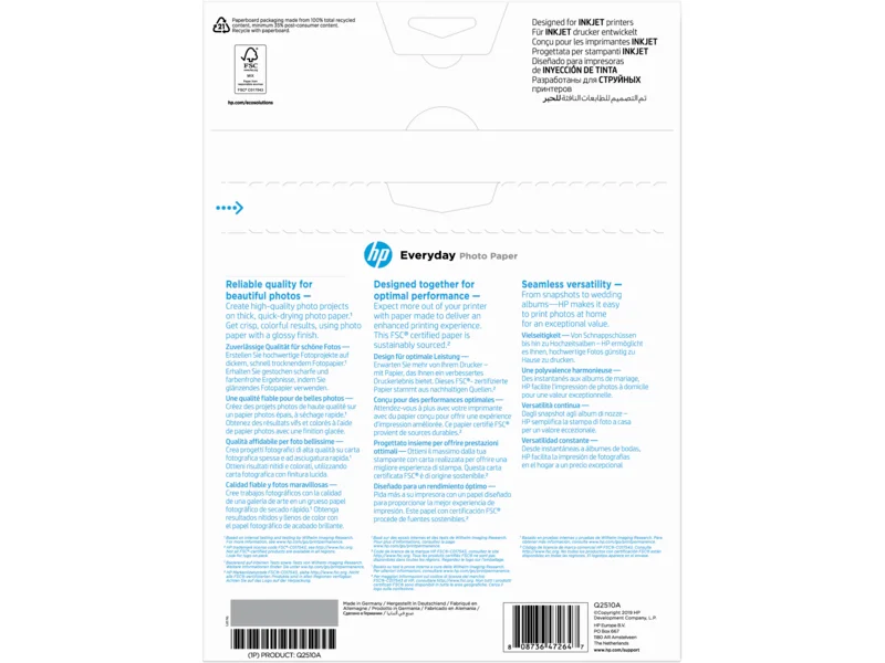 Łatwy w recyklingu papier umożliwia ekonomiczne drukowanie kolorowych, codziennych projektów fotograficznych. Błyszczący papier szybko wysycha i można go stosować w każdej drukarce atramentowej. Oprogramowanie HP Photo Creations umożliwia przemianę zdjęć między innymi w sześciany z obrazami, biuletyny i kalendarze.