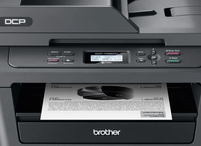 DCP-7065DN to czarno-biała drukarka, skaner oraz ksero w eleganckiej kompaktowej obudowie. DCP-7065DN drukuje z prędkością do 26 stron na minutę, a pierwsza strona gotowa jest już po niespełna 9 sekundach. Jedno urządzenie wystarczy, aby zapewnić sprawną pracę niewielkim grupom roboczym. Dla urządzenia DCP-7065DN dostępne są wysokowydajne tonery pozwalające na wydruk 2 600 stron, a funkcja Toner Save Mode dodatkowo pomaga zmniejszyć jego zużycie. Funkcja automatycznego druku dwustronnego pozwala zredukować ilość zużywanego papieru, a tym samym obniżyć koszty. Dodatkowym atutem jest funkcja druku kilku stron (2,4,9,16 lub 25) na jednym arkuszu. Zarządzanie dokumentami w firmie ułatwia opcja skanowania do poczty e-mail, obrazu, czy pliku OCR.