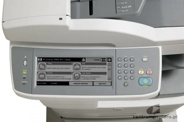 | Obsługa papieru | Uniwersalny podajnik na 100 arkuszy, dwa podajniki na 250 arkuszy, automatyczny podajnik dokumentów (ADF) na 50 arkuszy, opcjonalny moduł automatycznego druku dwustronnego, opcjonalny podajnik na 500 arkuszy z podstawą z szafką, opcjonalne wbudowane trzy podajniki na 500 arkuszy, odbiornik na 250 arkuszy |