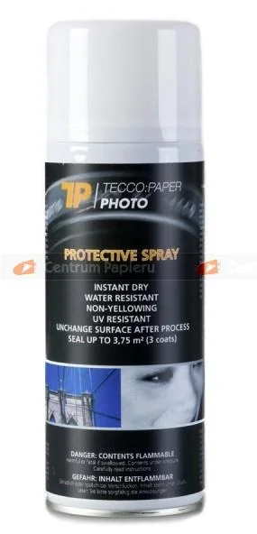 Spray do zabezpieczenia wydruków atramentowych. Po wykonaniu warstwy na wydruku, tworzy powierzchnię zabezpieczającą przez brudem, odciskami palców i wilgocią. Pozwala również chronić przed promieniowaniem UV, który powoduje blaknięcie kolorów. Zjawisko to może zachodzić przy używaniu technologii tuszy barwnikowych. Szczególnie polecamy używanie Tecco Protective Spray, kiedy używane są tusze zamienne. W przypadku druku w technologii pigmentowej, spray zabezpiecza dodatkowo przed uszkodzeniami mechanicznymi. Skład chemiczny pozwala na używanie Tecco Protective Spray przy zabezpieczaniu archiwalnych wydruków Fine Art.