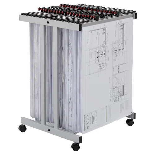 Ten wysokowydajny stojak maksymalizuje liczbę rysunków przechowywanych na metrze kwadratowym powierzchni podłogi i łatwo nim manewrować w biurze. Pomieści do 20 wieszaków, przy pojemności do 2000 arkuszy zależnie od ciężaru papieru.