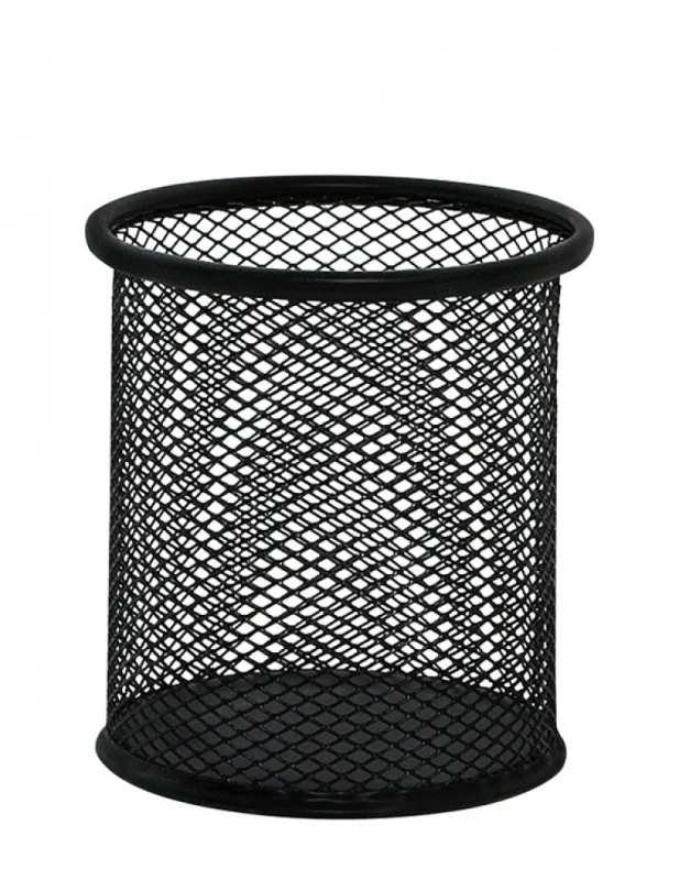 Pojemnik na długopisy czarny, metalowy w kształcie cylindra.